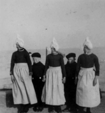 Alice Brill, Crianças, Holanda, 1934, reprodução Daniela Alarcon, copyright acervo Alice Brill Nas tres imagens editadas acima - alguns registros do exílio - vemos fotos de paragens da Espanha pelas quais Alice e Marte passaram, antes de chegarem ao seu destino na ilha de Maiorca. Na foto do mercado percebemos a atenção nos detalhes e minúcias perante as localidades visitadas, de passagem. Na imagem do mercado, ainda que não muito contrastada e sem muita nitidez, notamos um flagrante do registro do cotidiano, em seu movimento, a observação concentrada na disposição do corpo das pessoas ali presentes - do homem, à frente do legumes empilhados, em sacos, assim como das mulheres, com seu lenços típicos, usados na Espanha, no período. Algumas décadas depois, em fotos de Alice realizadas na cidade de São Paulo, algumas também de mercados e feiras, iremos encontrar olhar semelhante em um registro documental substantivo de flagrantes da vida cotidiana. Já na foto de Alcudia, 1933, aparentemente, chama a atenção de Alice o muro e uma construção de pedra, com suas torres, material muito utilizado na arquitetura local, na época. Estas obras, compõem assim, respectivamente, em primeiro plano, com a estrada de terra e a criança, à direita, ao fundo - planos diferentes recortados pelo seu olhar. Por sua vez, a foto das crianças, na Holanda, parece uma montagem, em virtude de sua simetria - ou seja, vemos três moças, com as mesmas roupas e chapéus típicos femininos usados antigamente neste país, entremeadas por dois meninos, praticamente da mesma altura e também com vestimentas iguais, em uma rua/passagem de pedra, na frente do mar. Além disso, os dois meninos estão de mãos dadas com as moças, no meio delas, como se elas estivessem protegendo-os. É interessante perceber que os rostos das moças dão um ar de anonimato e de homogeneidade à fotografia, pois seus olhares e expressões praticamente ficam escondidos pelos chapéus, além do fato de suas vestimentas, assim como dos meninos serem iguais. A impressão, que se capta da foto, “uma espécie de síntese deste país”, pois todos os personagens aparecem com trajes típicos, à frente do mar, que é um outro índice significativo deste lugar. Além disso, à frente do foto, fica registrada uma sombra alongada - Alice Brill e sua câmera fotográfica.